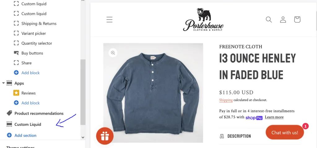 First, head over to the Klaviyo documentation and find the default snippet they provide for the old-school default Shopify themes. Normally, you would insert this at the bottom of the theme.liquid file in your theme. You can still do this, but you can also simply add a “Custom Liquid” block to the bottom of your Default Product template in the Theme 2.0 customizer and paste the code in there.